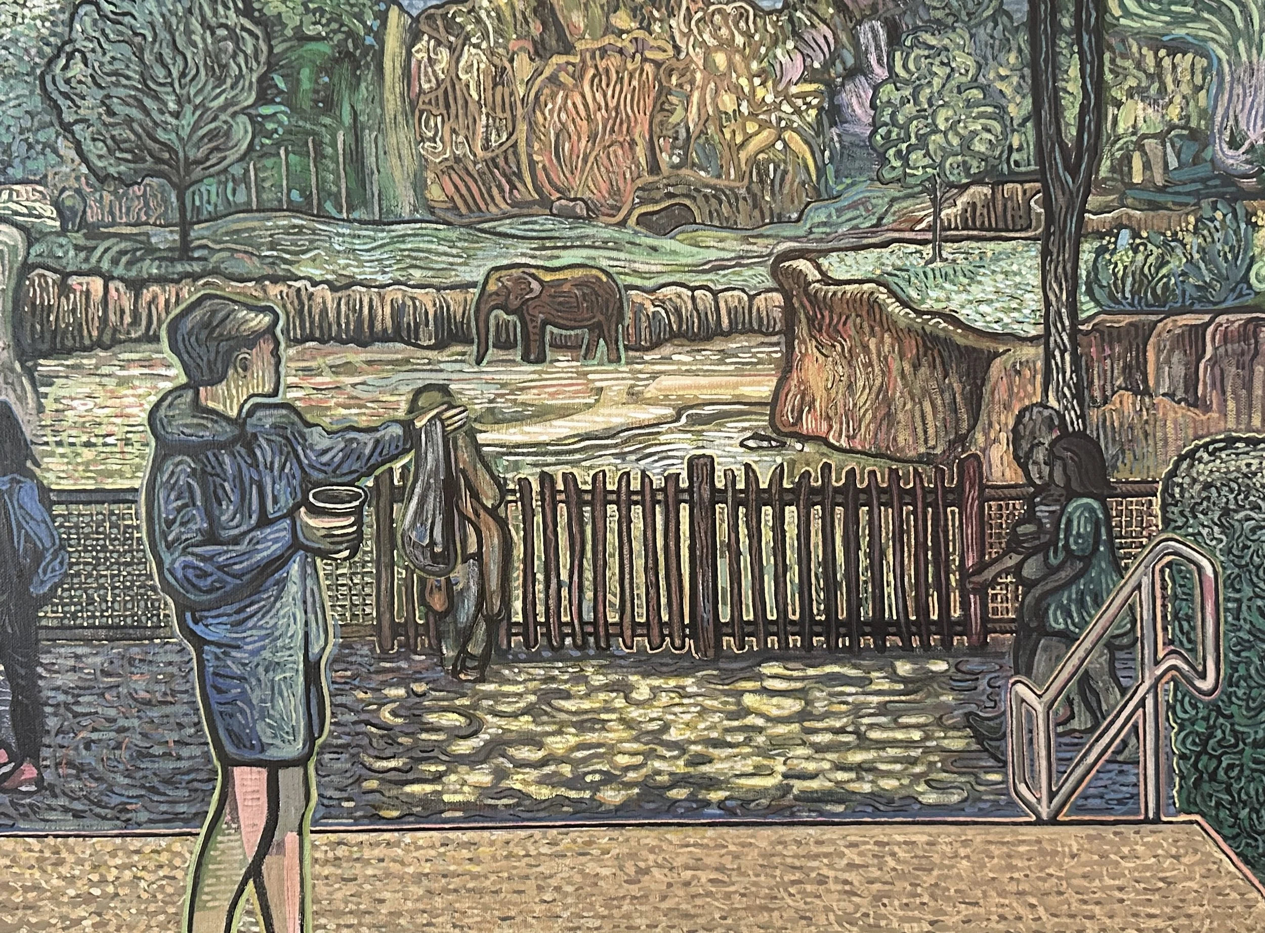 In traveling the U.S. and beyond, I’ve been drawn to paint zoo habitats. I’m intrigued by what metaphorical associations they can convey for our world at this time. One such meaning is derived from the map of the zoo being a kind of map of the planet, with boundaries, categorizations, routes, changes in scenery, etc… Another such association focuses on displacement, a consequence of a globalized economy. The titles of the works, borrowing from the name of the zoos depicted, reinforce this idea by highlighting the meaninglessness of place. That said, it is my hope that they also recall the beauty of the larger natural world we inhabit.